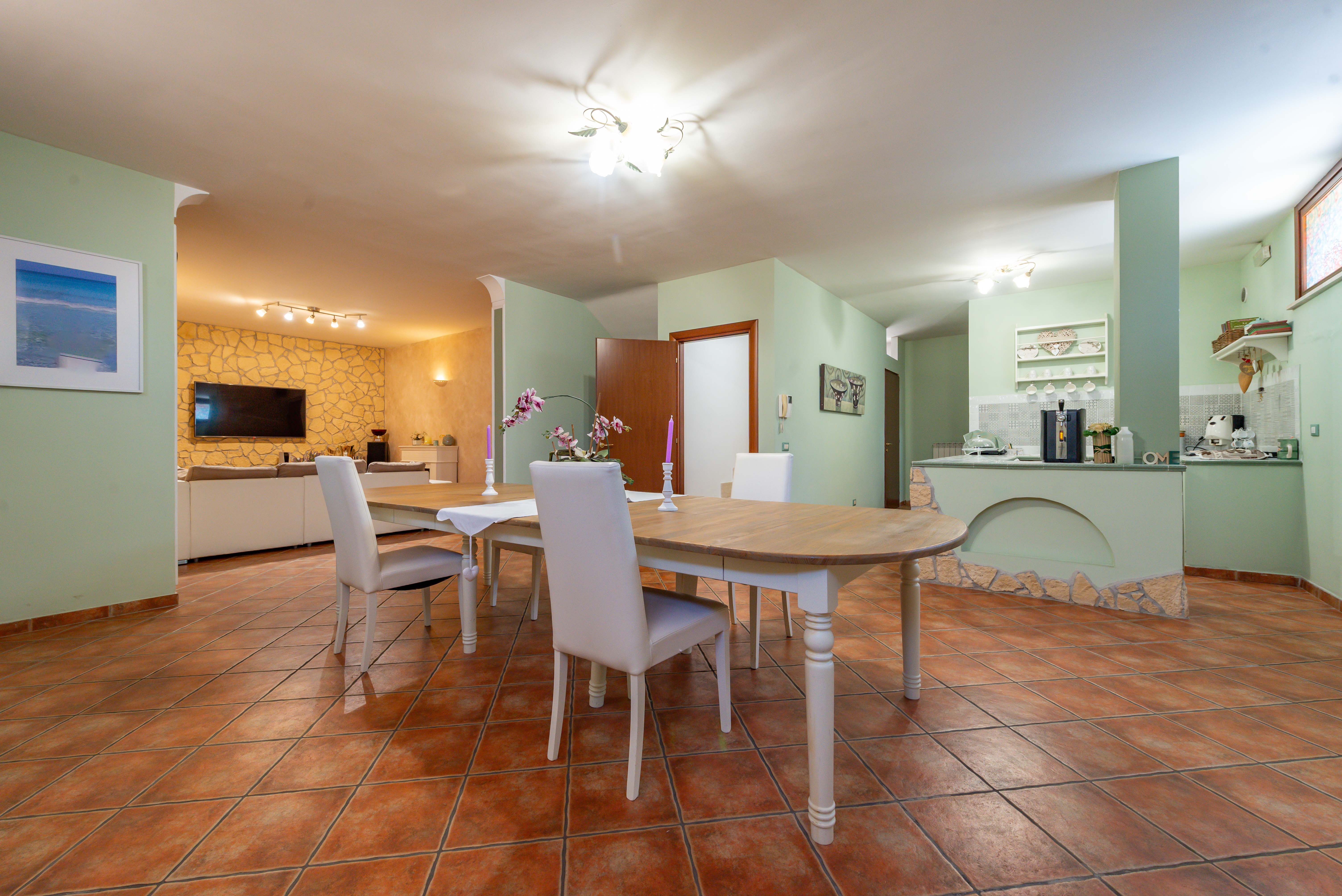 All’ingresso troviamo un ampio salone, perfetto per accogliere ospiti e vivere momenti conviviali, una cucina a vista con accesso diretto al giardino, e servizi.